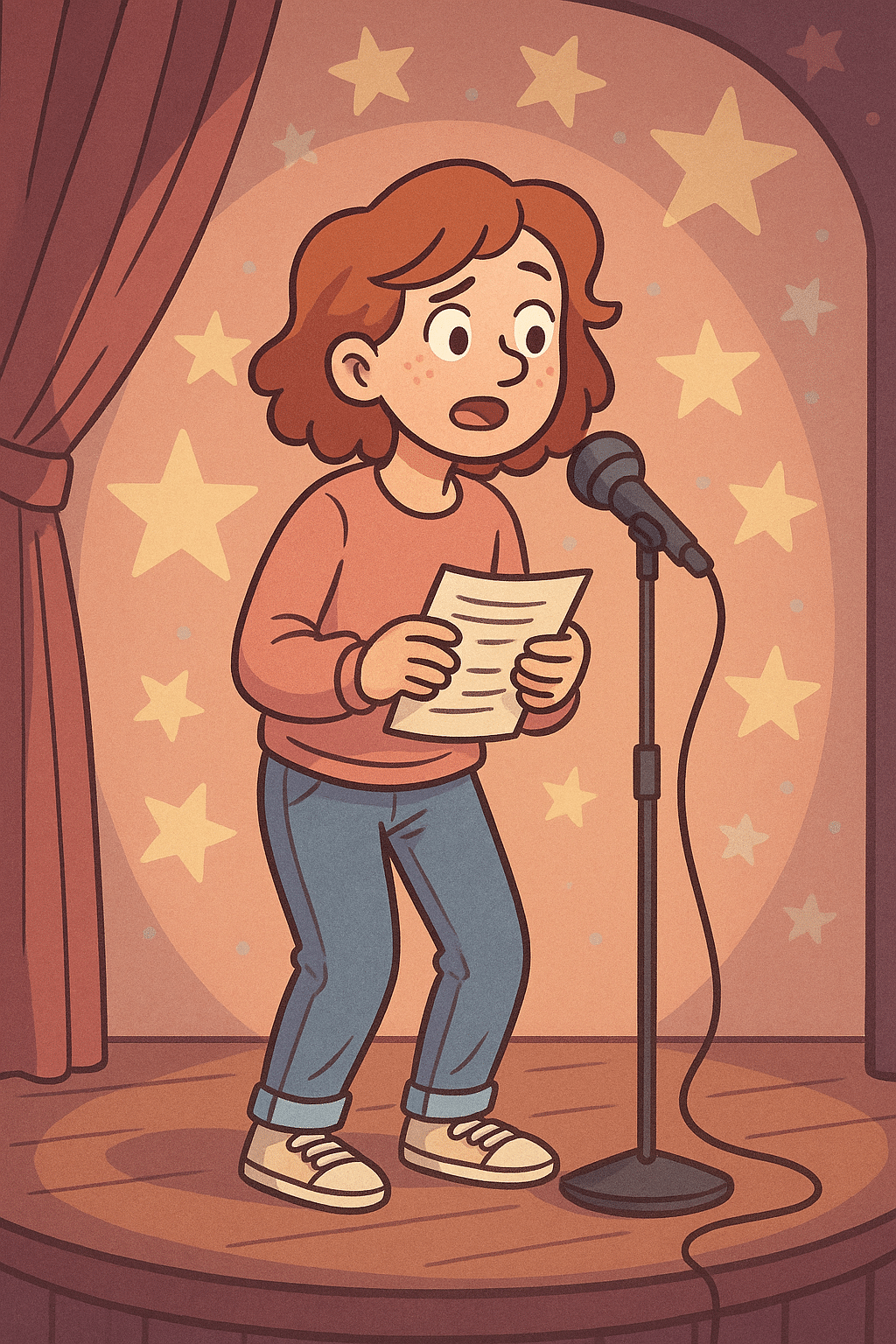 Positionering – undvik att gömma dig bakom mikrofonstativet. Steg fram när du vill förstärka en poäng och stanna när du levererar punchlines.